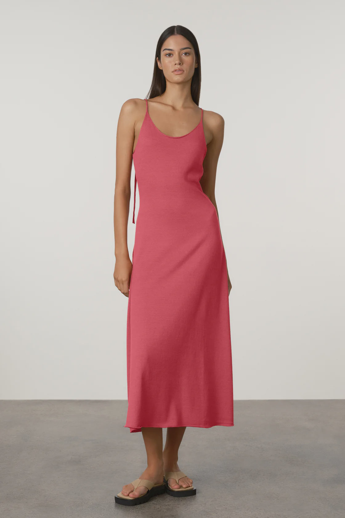 The dress of the season - made from a soft, textured knit fabric with a scoop neckline and delicate adjustable straps. Features a cutout and tie detail on the right shoulder. Full length in a vibrant berry pink. A bold, unique style.
