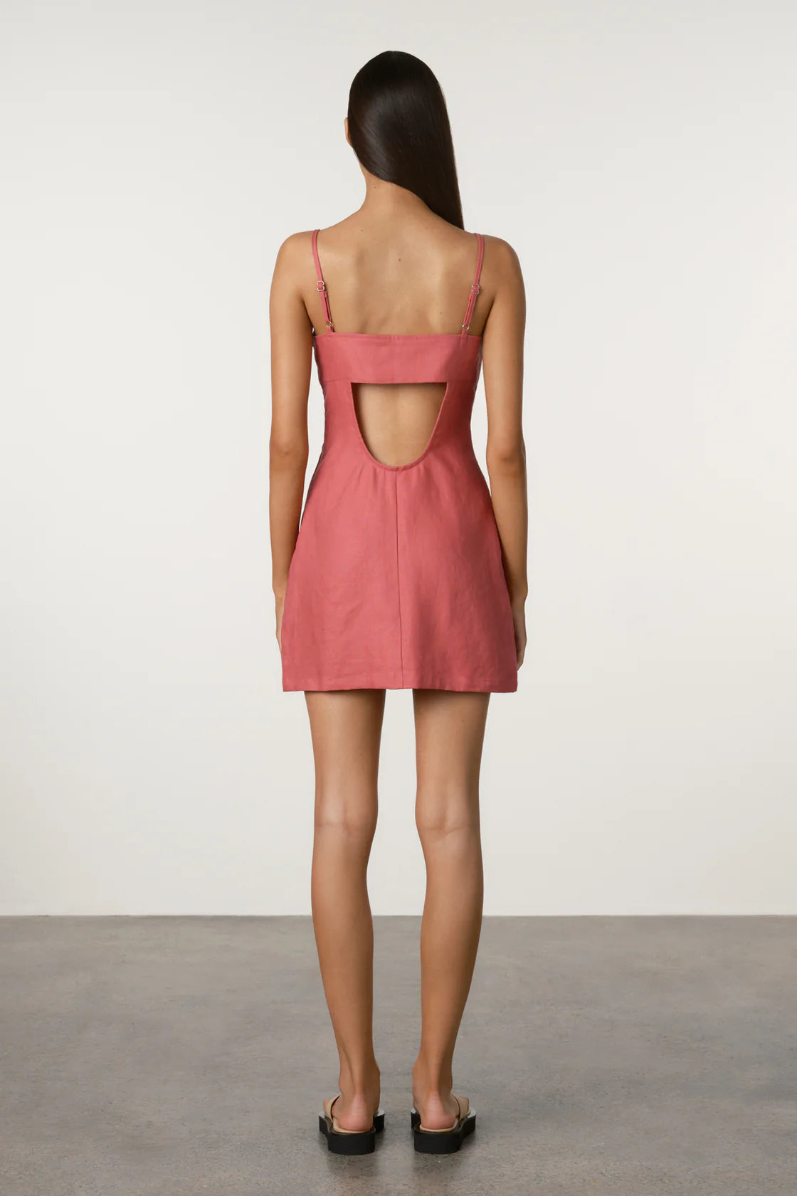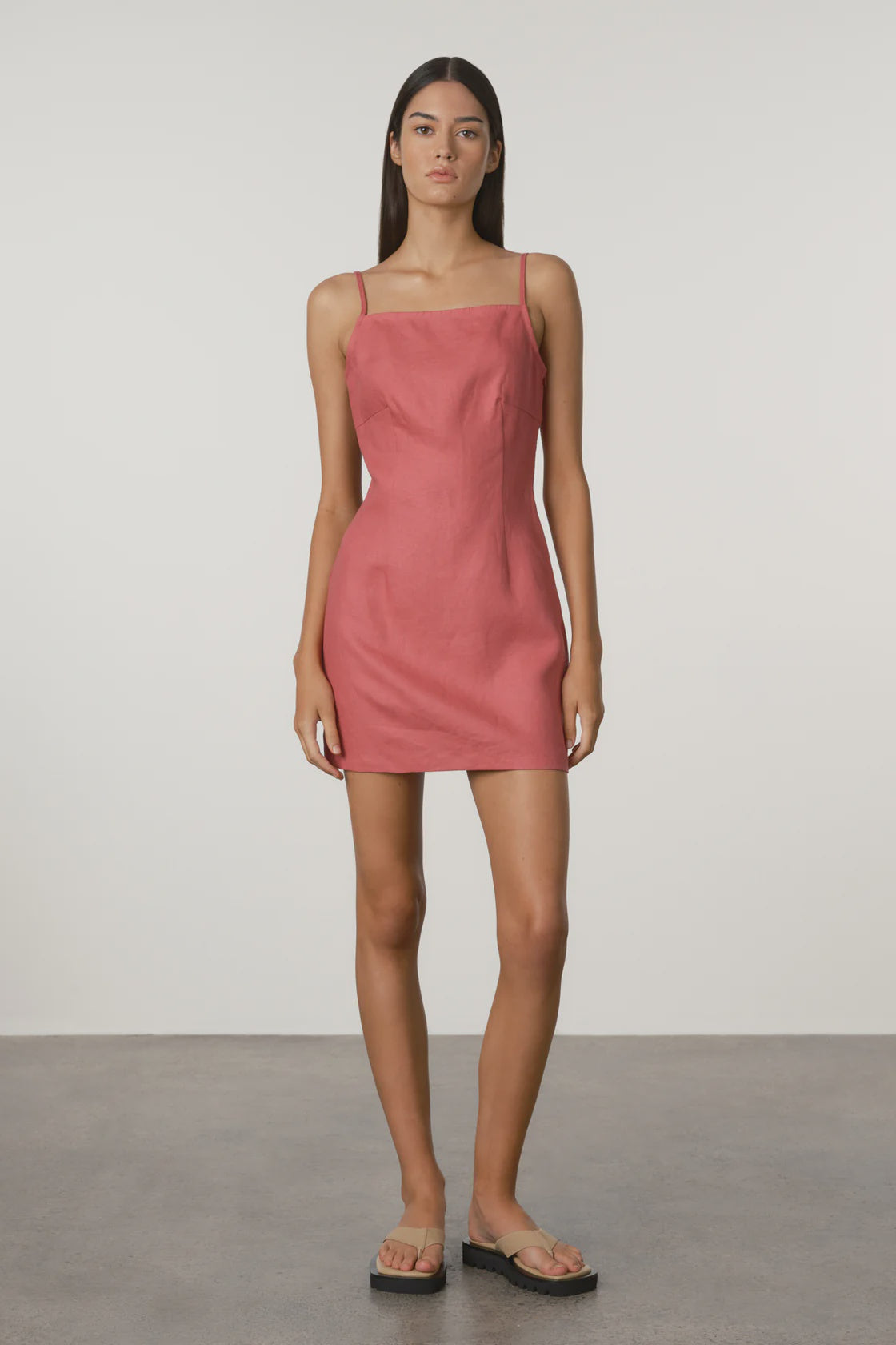 Bold in berry pink, this linen mini features a straight neckline, sleek back cut-out, and soft princess seams that sculpt a clean, flattering silhouette.