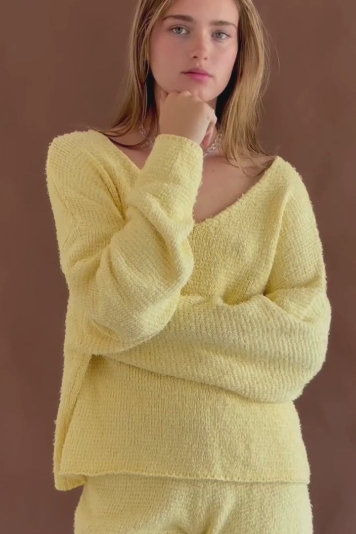 A textured, midweight knit with a relaxed fit. Features a soft V-neckline, dropped shoulders, and voluminous long sleeves. Finished in a bright butter yellow with a slightly sheer feel.