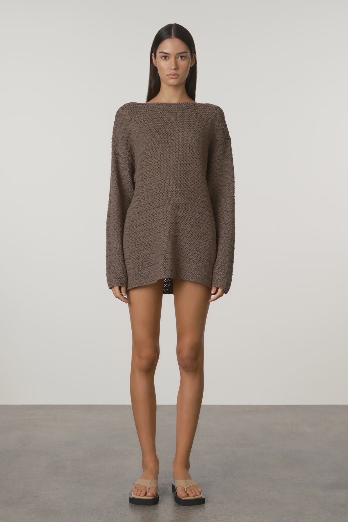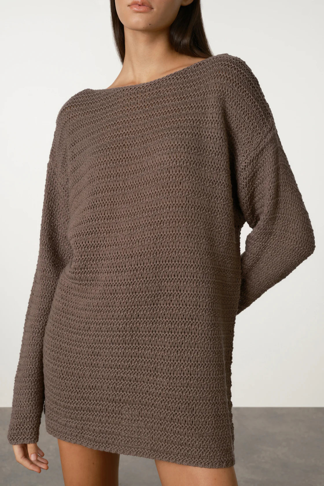 A crochet-style knit crafted from soft, mid-weight cotton yarn in a rich carob hue. Designed with a relaxed, oversized silhouette, featuring a boat neckline and long sleeves. Perfect as a breezy mini dress or layered as a lightweight jumper over your bikini.