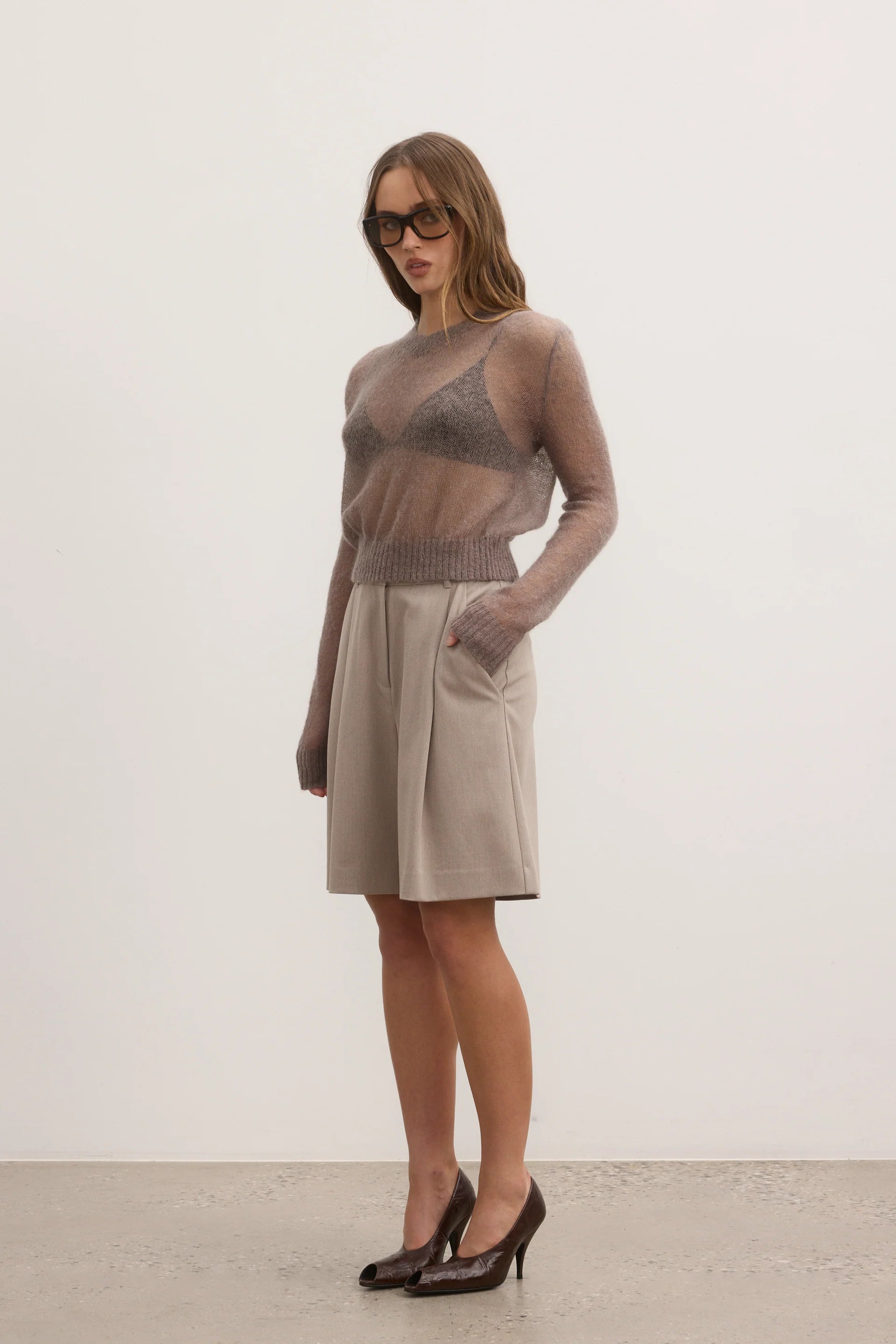 Introducing our Maudie knit a sheer, featherweight knit designed for effortless layering. The Maudie features a soft V neckline, long sleeves, and a subtly cropped silhouette, crafted from a luxe mohair blend for a light, airy feel. Wear it over tonal underpinnings for an understated, elevated look.