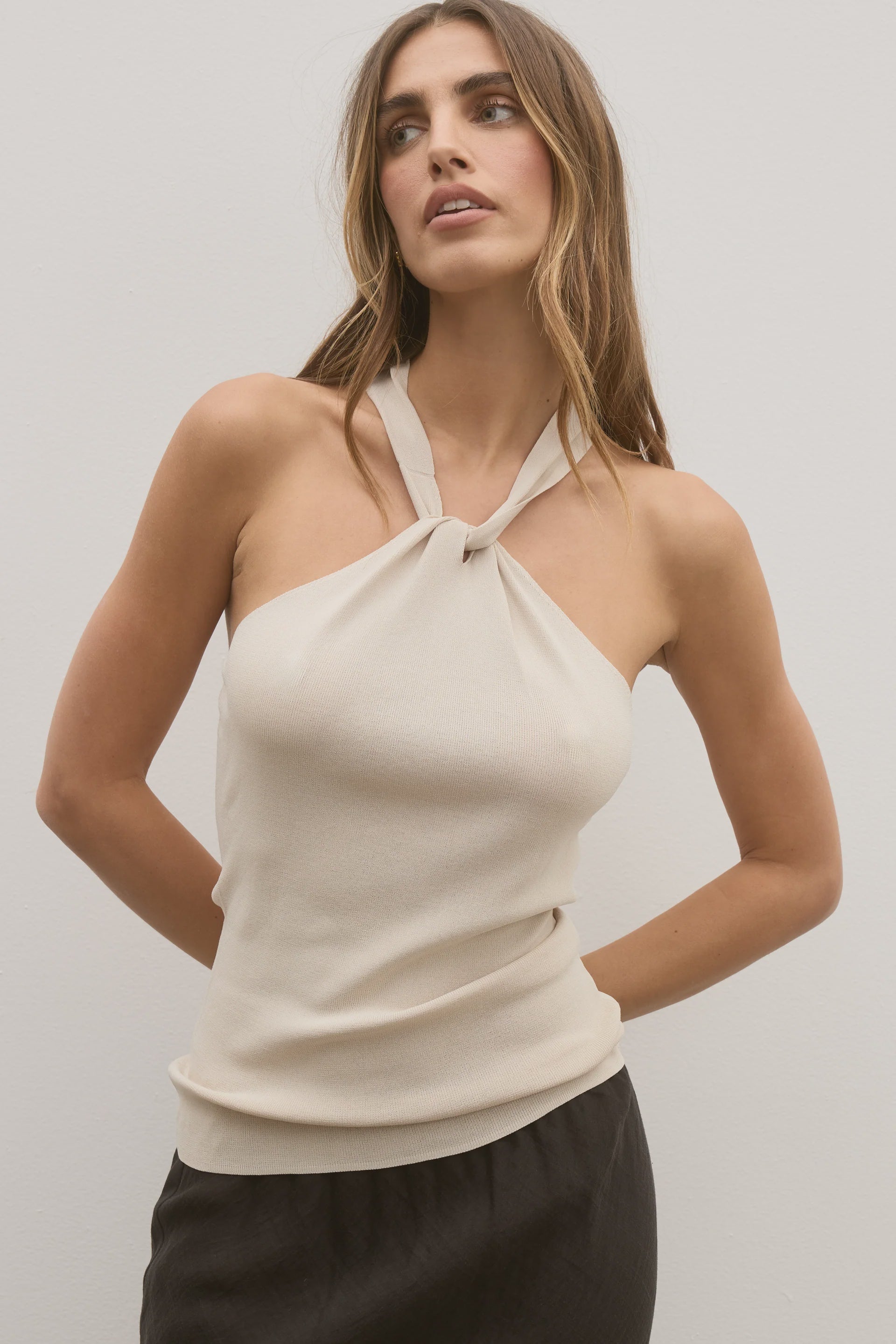 Introducing our Maven Top features a knotted halter neckline that frames the shoulders with ease. Crafted from a soft, stretch-knit fabric, this body-skimming silhouette blends modern minimalism with subtle detailing.