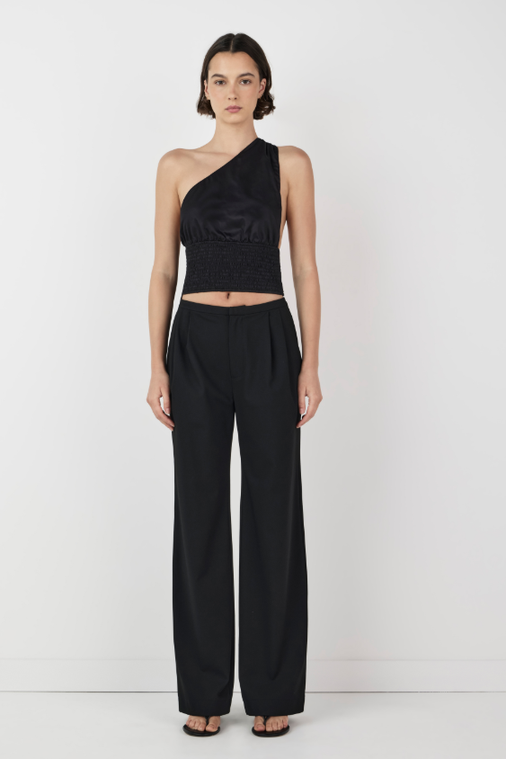 The Sammy Asym Top is a one shoulder asymmetrical bodice with a shirred fitted waist panel. The top has a single strap extending from the front fastening to a button at the back.