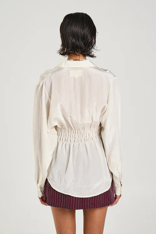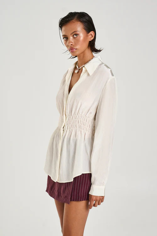 The Shirred LS Shirt in Sand is made from a viscose blend featuring a textured, crinkled effect. It offers a tailored yet gently draping shape, highlighted by a shirred, cinched waist for a refined fit.