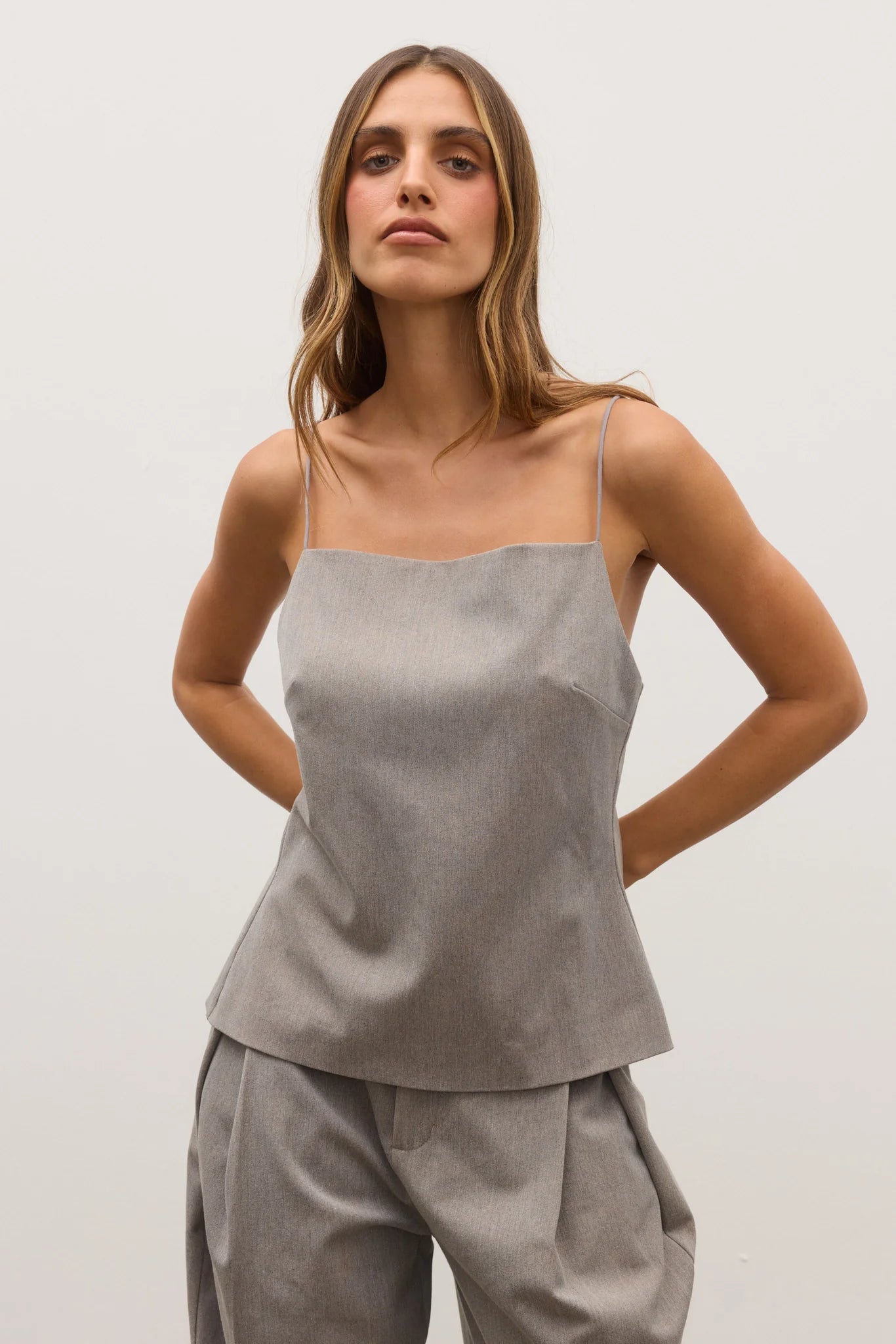 Meet Tamia, tailored with intention and crafted from a refined suiting material, it features a high neckline and clean front for a polished silhouette. The open back reveals a bold contrast, finished with a delicate tie detail at the mid-back. Designed to sculpt through the body with subtle shaping seams, it’s the perfect blend of sharp and soft—ideal for layering with our Chelsea pant and you can finish the look with our Evie blazer.