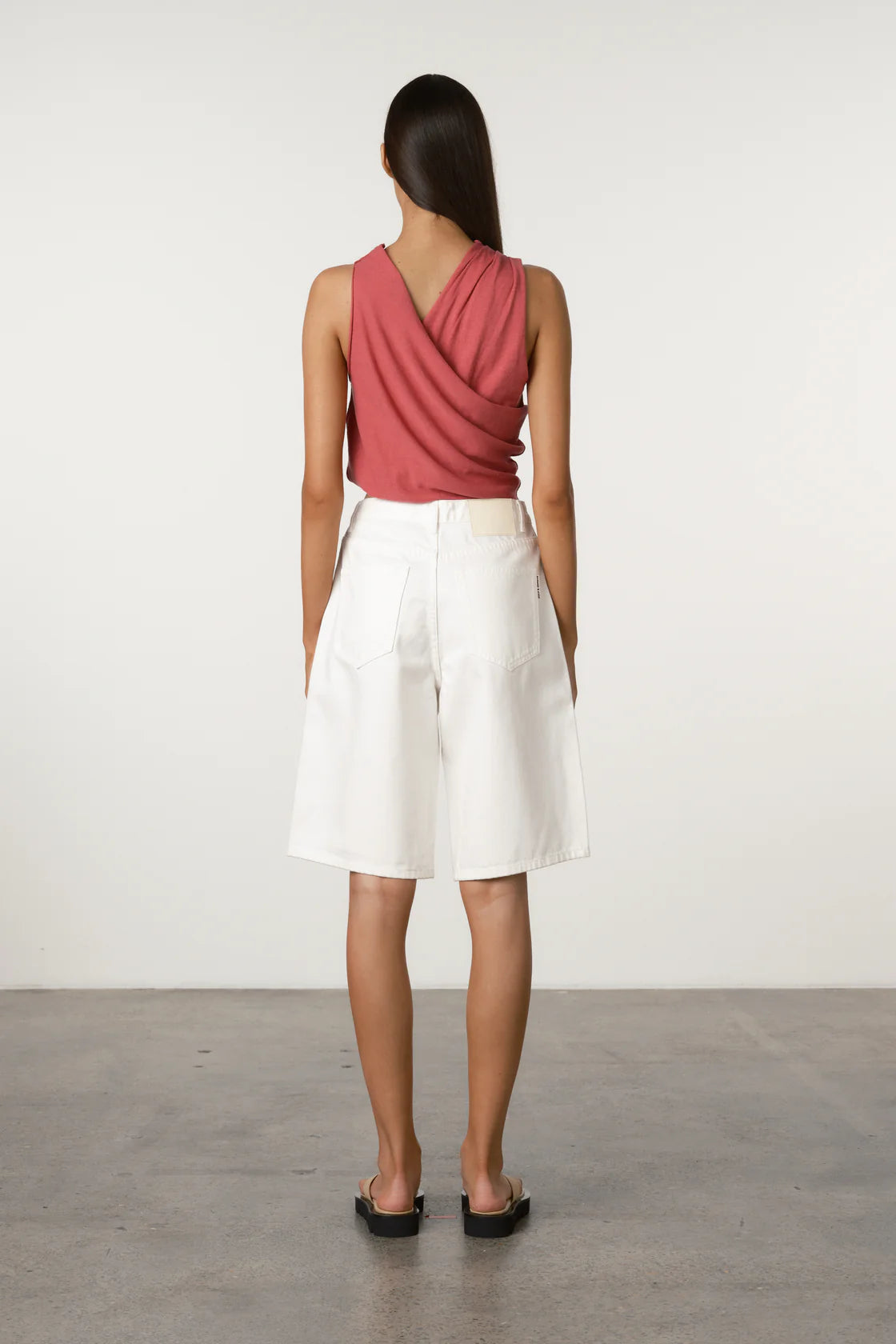 Crisp in classic white, these mid-rise shorts are your new go-to for effortless, everyday style. Made from rigid denim, features a classic 5-pocket design and a zip-front fly closure. The relaxed, longer-length silhouette is the perfect balance between laid-back comfort and effortless chic.